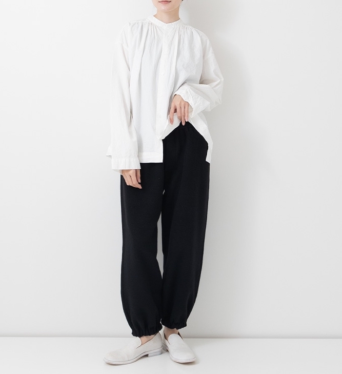 上質ながらも、裾をゴムで絞りカジュアルなシルエットに。