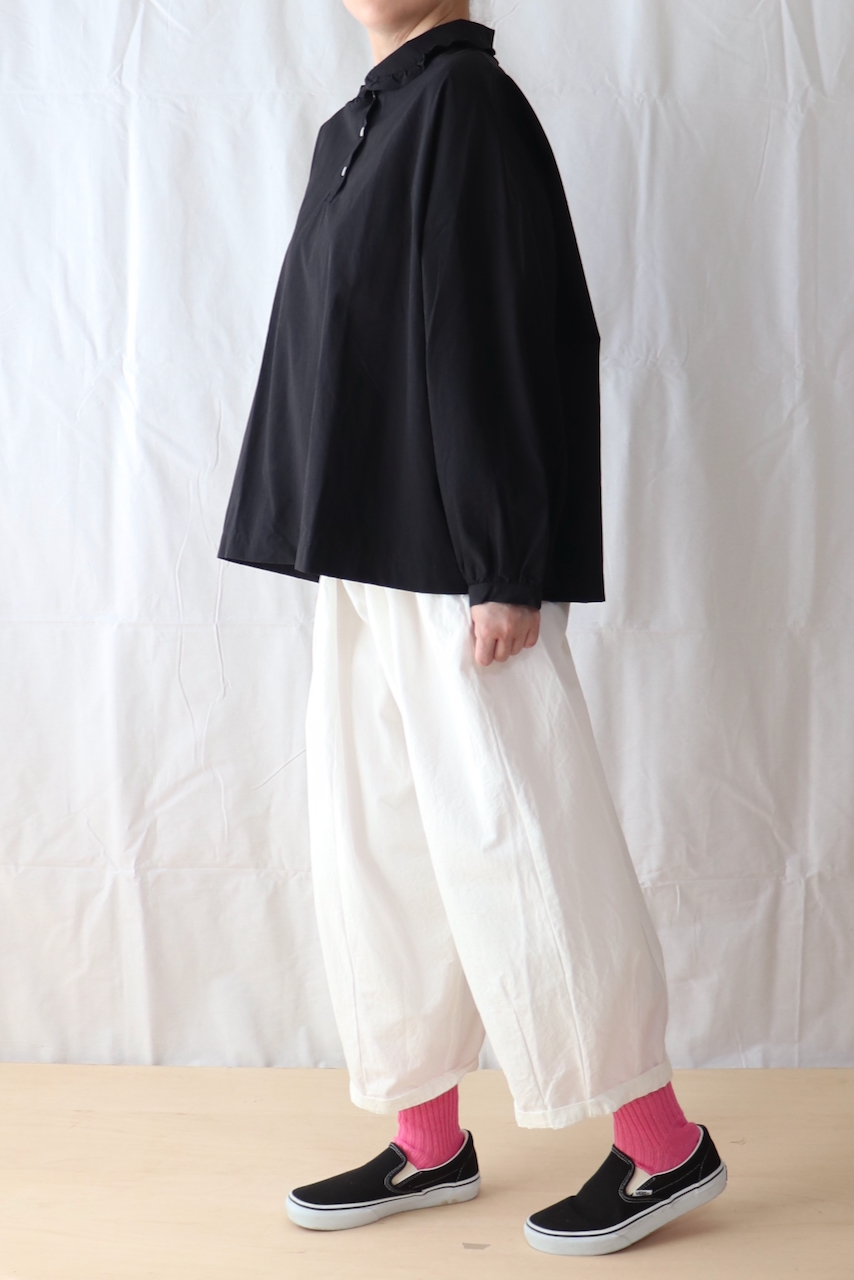 丸襟にさりげなくフリルをあしらって大人ナチュラルな雰囲気のあるブラウス。