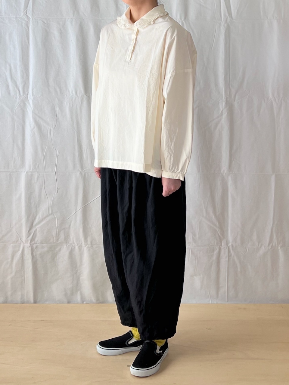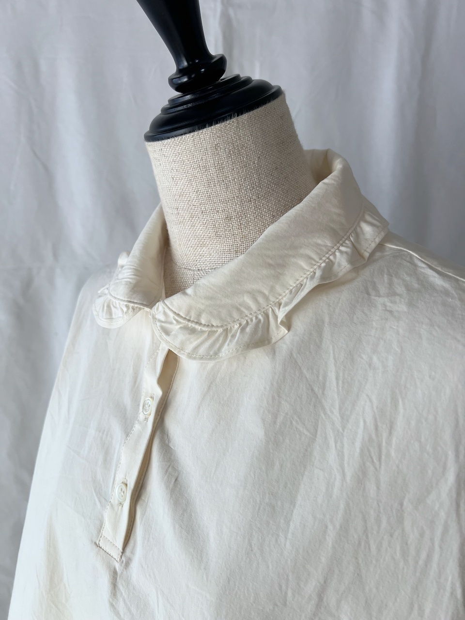 丸襟にさりげなくフリルをあしらって大人ナチュラルな雰囲気のあるブラウス。