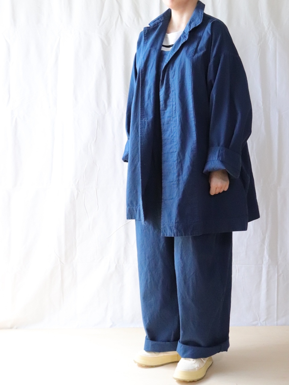 毛羽の少ない高品質なコーマー糸を使用しています。製品染めを行うことで随所にパッカリングが起こり、洗いざらしの似合うカジュアルな雰囲気に仕上がっています。