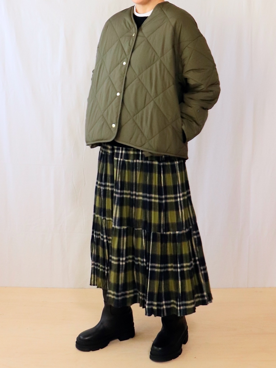 たっぷりと生地を使っていますが、ボリューム感を押さえたシルエットが大人っぽくまとまるポイントです。