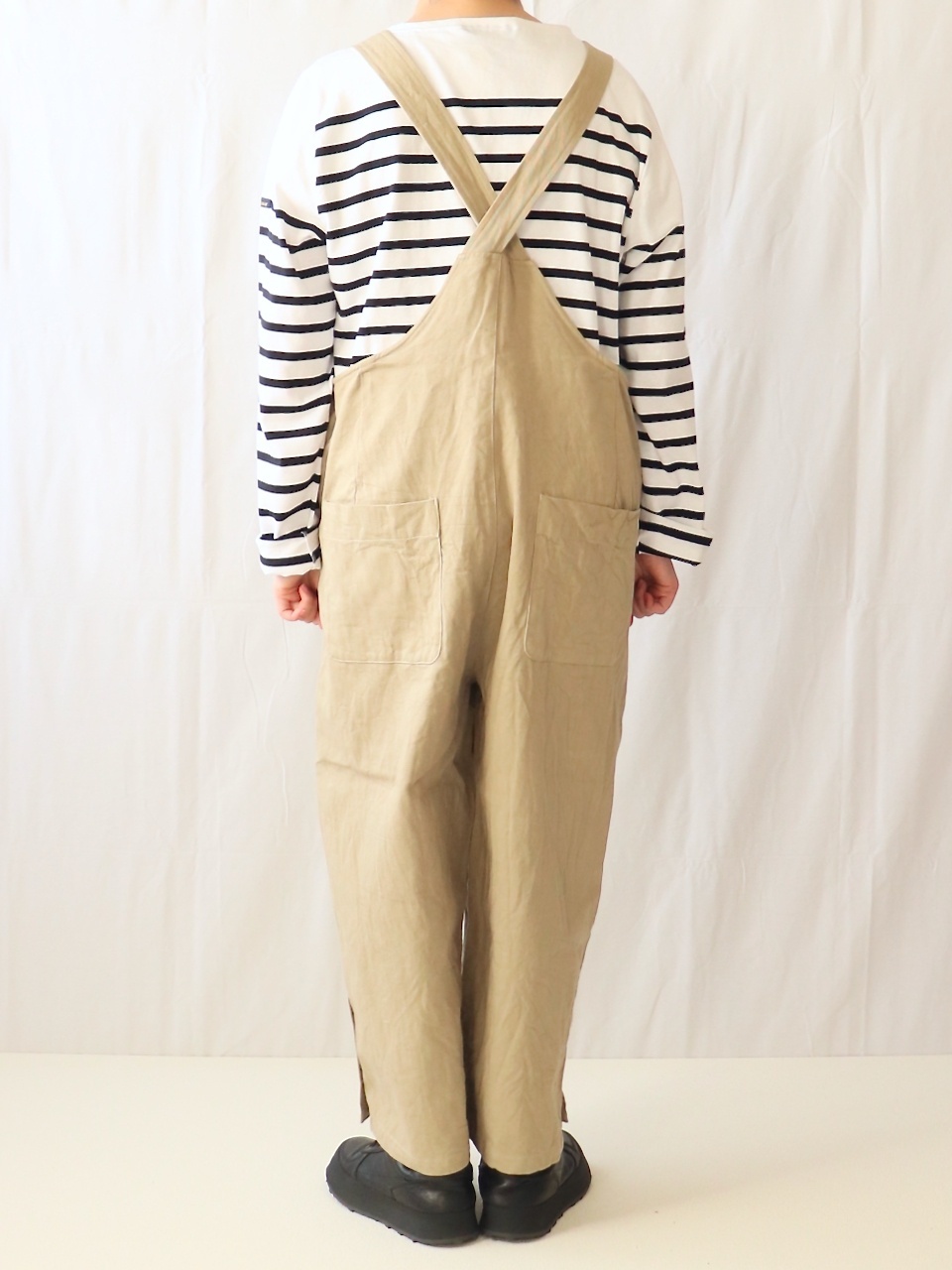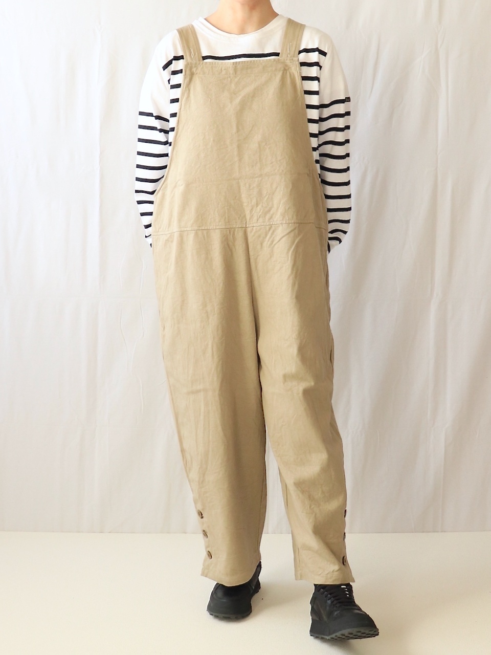 程よくゆったりしたシルエットですが、全体のラインがきれいなので子供っぽくならない大人のサロペットに仕上がっています。