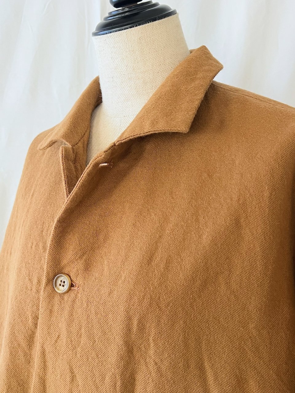 ふわっと起毛した、軽く柔らかなウールコットン素材のロングコート。天然繊維に洗い加工を施し、膨らみと暖かみのある風合いが特徴です。